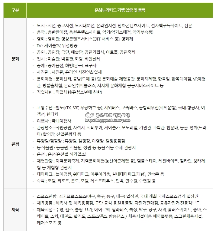 - 스포츠 · 체육 : 야구·배구·농구·축구 관람 및 응원용품 구매, 전국체전, 유소년체육대회, 국제스포츠경기, 기타 스포츠경기 관람입장권, 운동용품(체육사, 체육용품점), 승마장, 수영장, 빙상장, 볼링장, 탁구장, 당구장, 헬스장 등