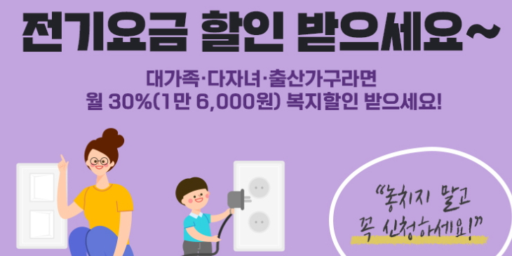 곧 있으면 여름인데요. 전기요금 할인받으면 이번 여름 무더위는 조금이나마 버틸 수 있겠네요. 전기요금할인은 신청일 속한 월분부터 바로 적용되니 바로 신청하시고요. 출생신고하면서 전기할인 신청하면 한전에 통보가 되고, 아파트에 거주한다면 전기요금 할인이 적용될 겁니다. 그런데 간혹 한전에서는 할인을 해줬는데, 아파트 관리사무소에서 누락하는 경우도 있으니 신청후 확인을 꼭 해보시기 바랍니다. 전기료 할인외에도 다양한 혜택이 있는데, 자세한 내용은 [기초생활수급자 혜택정리]글을 참고해주세요.